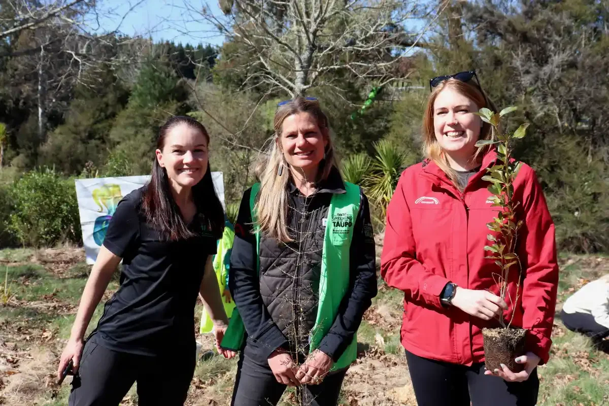 Current Kids Greening Taupō coordinators Rachel Thompson (L) and Heidi Pritchard (centre), with Sam Shortland (R) from sponsor Contact Energy | 📷: Anna Calvert