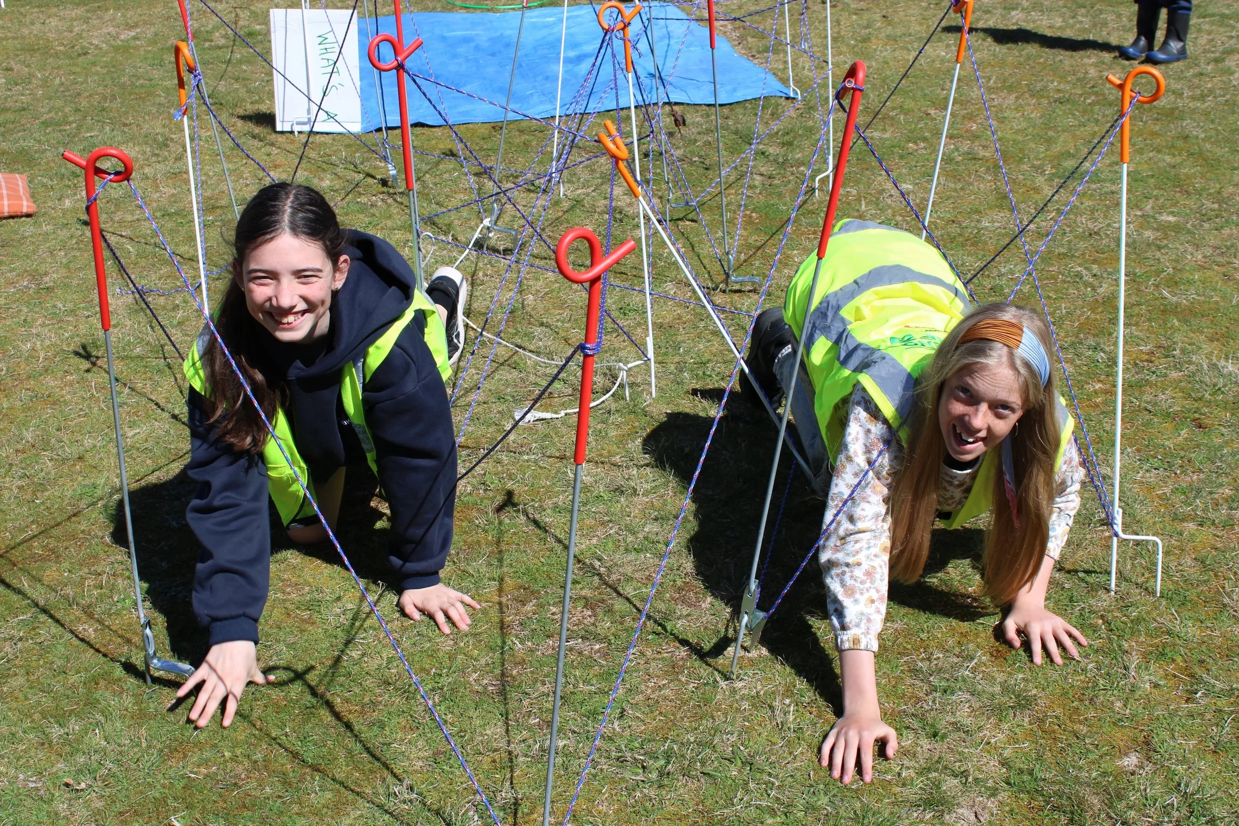 Megan Brown and Poppy Harding work their way through an obstacle course.